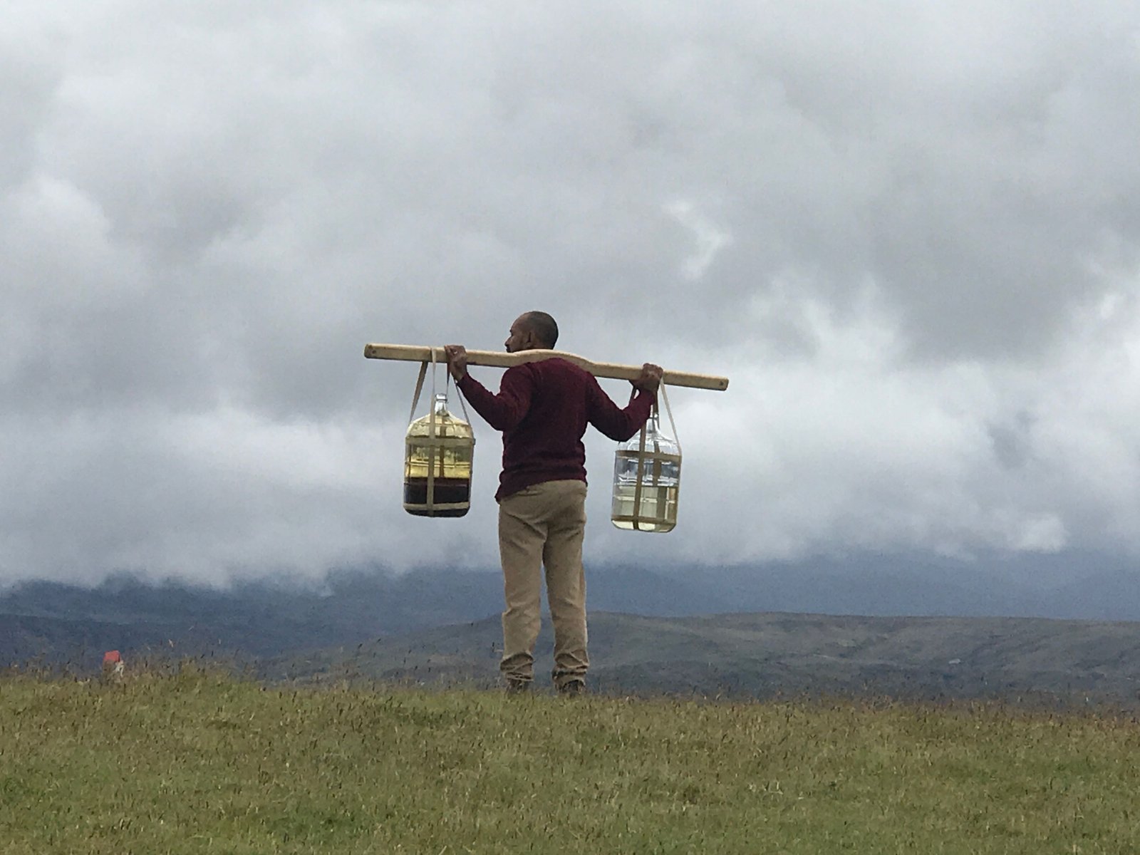 La obra se propone reconstruir un vínculo más estrecho con los estados del agua, una sustancia que aún insiste en conservarse pura y deslumbrante en algunos lugares de la Tierra, pese a nuestros ingentes deseos de permearla por los procesos de transformación que la economía en sus diversas escalas, ejerce sobre su uso y ocupación. Las pimpinas de cristal portadas por el performer como símbolo de la fragilidad de este recurso, contienen agua en su estado elemental y miel, cuyo simbolismo conecta con el alimento, lo sagrado, pero también con el pensamiento y su energía transformadora.
