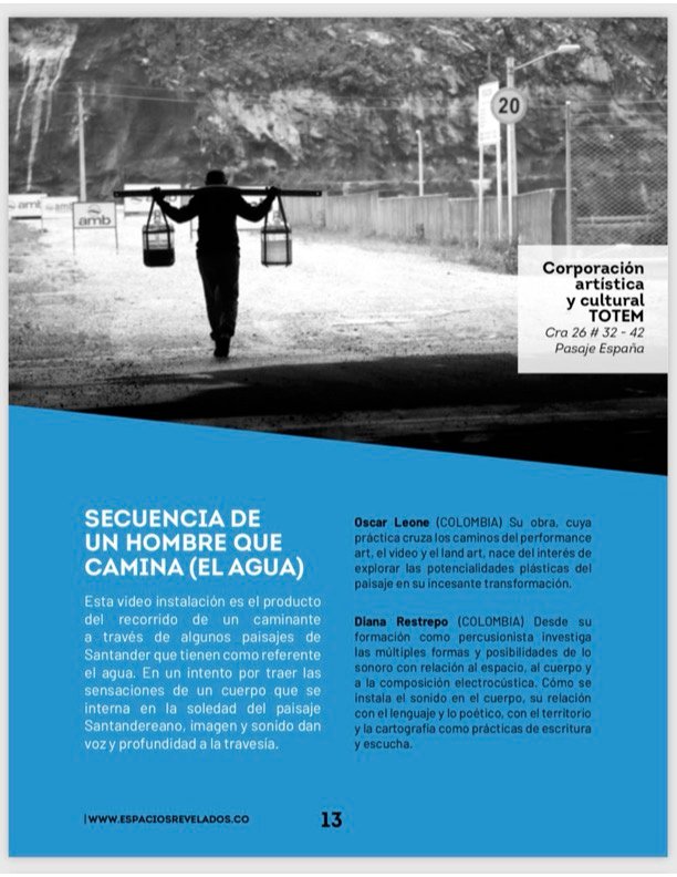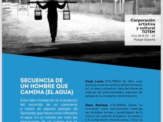 Video instalación, en colaboración con Oscar Leone, es el producto del recorrido de un caminante a través de algunos paisajes de Santander que tienen como referente el agua. En un intento por traer las sensaciones de un cuerpo que se interna en la soledad del paisaje Santandereano, imagen y sonido dan voz y profundidad a la travesía.